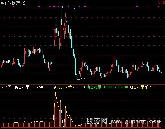 攻击量B:=-SUM(IF(C<REF(C,1),攻击量*C*V*10,0),FROMOPEN),COLOR00FF00,LINETHICK0;