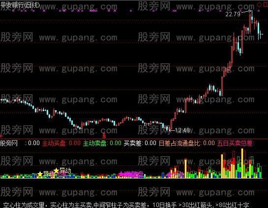 DRAWTEXT_FIX(1,0.01,0.9,0,'空心柱为成交量,实心柱为主买卖,中间窄柱子为买卖差,10日换手 >30出红箭头, >80出红十字'),COLORLIGRAY;