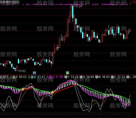 IF(大鱼B<=REF(大鱼B,1),大鱼B,DRAWNULL),COLORGREEN,LINETHICK2;