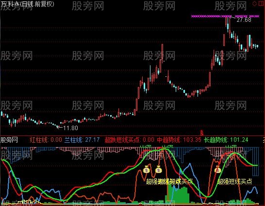 长趋势线:(SUM(中趋势线,6)) / 6,LINETHICK2,COLORGREEN;