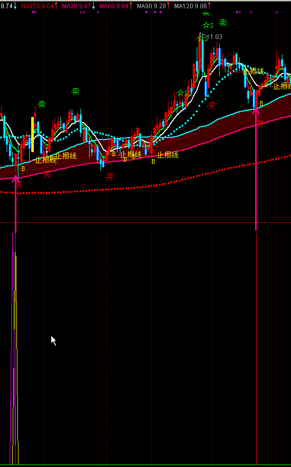小底:REF(IF((MA(C,5)-C)/C>0.04 AND (MA(C,10)-MA(C,5))/MA(C,5)>0.04,1,0),1),COLORYELLOW;