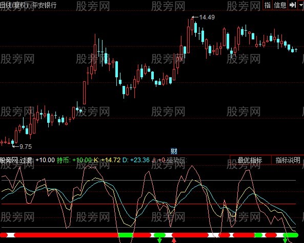 使用说明: 1,红柱持股,绿柱持币,白柱过渡 2,红箭头均线多头,绿箭头均线空头 3,配合上方KD指标.