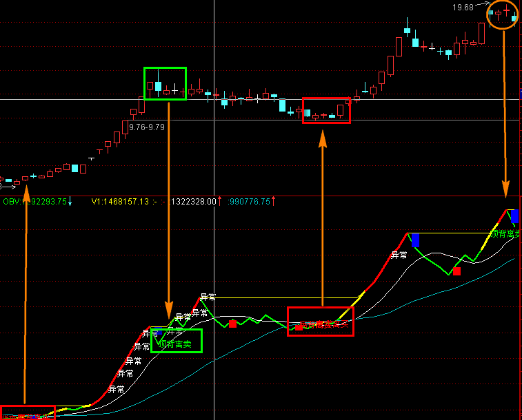 DRAWTEXT((((ABS((OBV - REF(OBV,1))) / ABS(MA(OBV,5))) > 0.07) AND (OBV > REF(OBV,1))),OBV,'异常');