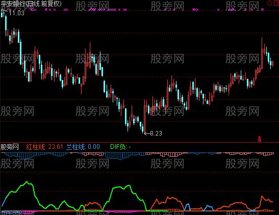DIF负:IF("MACD.DIF"(12,26,9)<0,兰柱线,DRAWNULL),COLORGREEN,LINETHICK2;