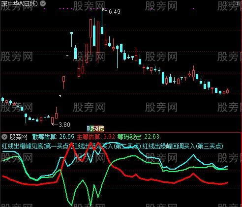 DRAWTEXT_FIX(ISLASTBAR,0,0,0,'红线出橙峰见底(第一买点),红线出蓝峰买入(第二买点),红线出绿峰回调买入(第三买点)'),LINETHICK2,COLORFFFF00;