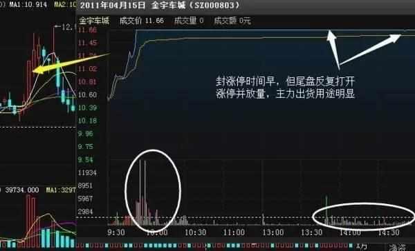 以涨停板开盘,随后开始回落,中途股价持续地位震荡走势,临近收盘又快速拉升至涨停,此类个股往往是主力出货的表现。主力利用早盘拉出涨停,腾出较大空间,随后利用散户跟风心里不断出货,尾盘再度快速拉涨停,以便以后继续出货。