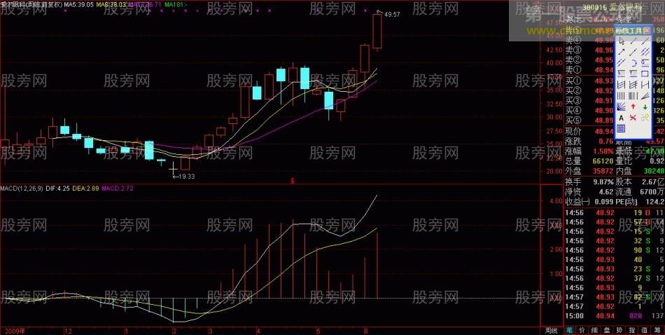 创新高的强势上涨模式,周线MACD在0轴上方出现龙抬头。案例 艾尔眼科 300015 2010年5月28日,周MACD出现O轴上方龙抬头信号,果断买入,三周连续上涨40%.