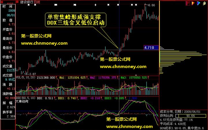 的移动成本分布图形。从图上看,该股在经过2008年的大跌后长时间筑底,在4.7元以下形成了明显的上升三角形趋势。但由于主力资金始终压制价格低位买入,股价未能形成向上突破。在上升三角形整理进入末端的时候,成本分布上形成了非常明显的低位单密集峰支撑,蓄势非常充分。在6月1日DDX出现大红柱,三线开始金叉上行后,股价终于迎来了爆发的时机。