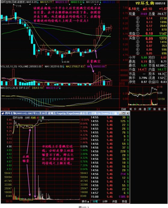 四、股价经前期大幅下跌后,在相对低位构筑一个平台,当某天突然放量跳空过平台,且不回补缺口,则当天可择机大胆介入。如下图所示: