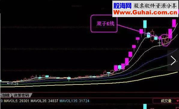 华谊集团(600623)在2016年1月14日的时候形态呈了双子K线组合形态,成交量也是放大,一直往上涨,涨幅69%。