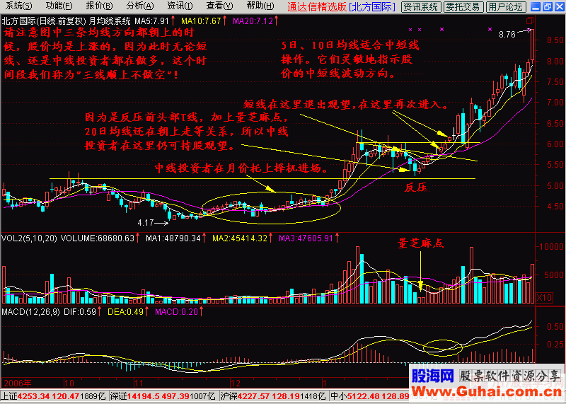 无论是月均线系统还是两者混合使用的系统,都有一个不变的原则,那就是所有的均线方向向上的时候,如果有成交量的配合,往往有一波上扬行情。