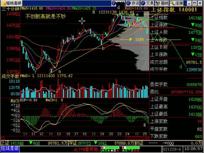 这几天指数走得比较关键,所以我们就用30分钟这种比较敏感的短线K线来观察它。我们发现它在e点没有创新高,【不创新高就死不妙】。见(图187-1)所示。