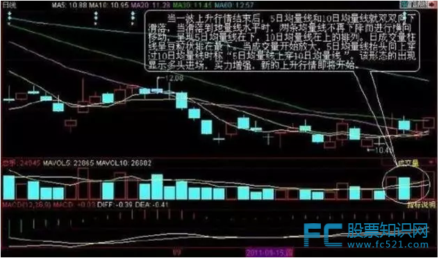 上升行情结束后,5日及10日均量线同时下滑,此时的成交量还是很大的,所以出现了5日均量线要快于10日均量线的下降速度,随之10日均量线被5日均量线击穿。当到达地量水平线的时候,两条线开始横向运行,并且开始粘合在一起,此时,5日均量线在10日均量线之下,此时的成交量柱线呈颗粒状排在最下,此时股价是最差的一个时期,后期成交量在某一天突然出现放大的现象,然后5日上穿10日均量线,此时说明多头开始进场,为很好的买人点,后期上涨行情马上要启动。