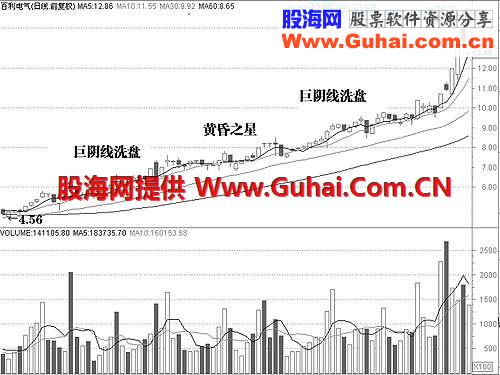 图1-28是600797浙大网新2006年的走势图,当时在市场一片高呼只有大盘蓝筹股才具有投资价值的时候,我在10月份发现了这只股票,并在11月7日大阳线后的一天震荡星线的尾市大量介入了该股,介入的第二天上市公司突然发布利好消息,公司出资收购境外一家与微软关系密切的战略合作伙伴,当天股价开盘后大幅冲高,而后不断回落,在接近持仓成本3个点的时候,我采取了暂时减持操作,目的是回避主力深幅的洗盘!后来在相对低位再次介入,最后的持仓成本为4.26元,目前股价已经到达14元而且还没有见顶迹象,此股在平时采取缓慢推高的手法,且经常逆市操作,持股心理压力很大,如果没有对其操作手法的深刻理解,是很难有信心持有到现在的。那么当时的“一九”现象中为什么能够准确判断此股未来的潜力呢,就是源于对前面一段股价沿切线波段上涨走势形态的深刻认识。K量三态分析方法就是让我们透过市场表面形态变化准确理解市场波动的成因,从而准确判断股价未来的趋势。这种走势在后面主力吸筹中还有论述。