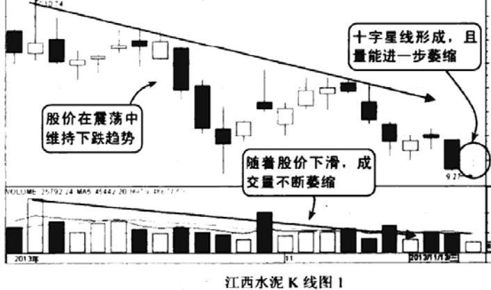 股价的下跌伴随成交量的不断缩小,十字星线的出现预示了市场存在着反转的可能性,给予了短线操盘者赚钱