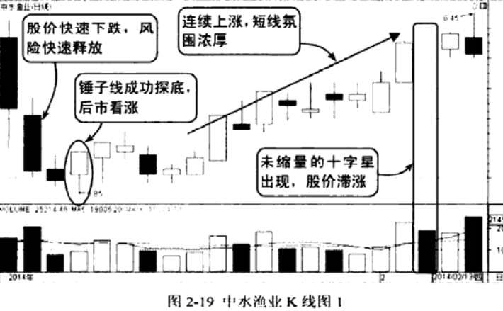 ,K线形成探底锤子线,之后股价连续上涨,形成短线操作机会,随即在高位区域出现了十字星线,这就需