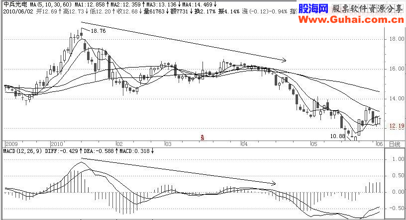 2009年8月5日达到高点7.13元,股价和MACD开始震荡收敛,至2010年3月15日开始粘合,直至4月16日开始发散向下,股价步入下跌之旅。把图形放大如下: