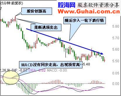 三、5分钟MACD顶背离。股价创新高时,MACD没有创新高,MACD出现顶背离。这说明短期趋势在走弱,主力资金在逐步撤离,一旦出货目的达到,股价很可能在当日反转向下,投资者应逢高减持,一旦股价反转则清仓出局。