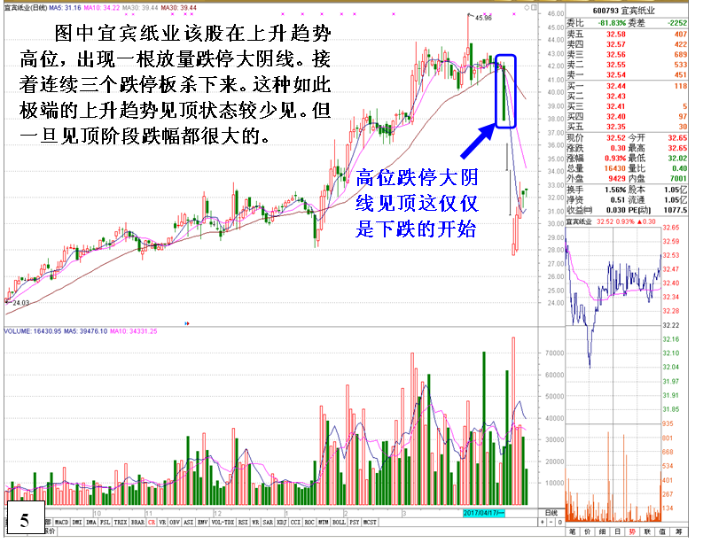 这两点都是上升通道个股见顶的经典标志,是一种典型的见顶K线特征。而这种见顶也有阶段性暂时见顶和上升趋势彻底见顶之分。无论属于那一种一旦出现见顶,股价短线下跌调整的幅度都很大。特别是在熊市,上升通道个股出现这两种见顶K线后十分危险。下面以上升通道个股收出巨量大阴线为例,介绍读解一下这方面的相关知识要点。
