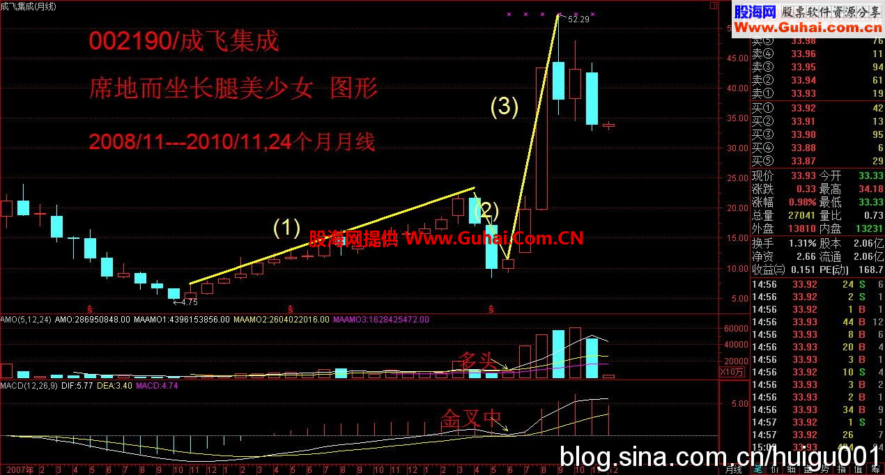 评析 1.基本完美。 2.大3浪攻击月AMO量能不达标,未多头排列。 3.平台回调时MACD曾死叉,但大3浪攻击时MACD在0轴上方金叉。 其他分析参见该类图形之前面的案例分析。