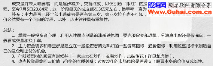 该股是只有2亿股的小盘股,容易出现比较大的波动。对于小盘股,在大盘处于上涨趋势时操作往往向上的波动性更强,获利也较高。如果在大盘处于下行趋势中操作,则很可能出现大跌的巨额亏损。 从技术周时来看,从7月份的低点7.5元左右上涨到9.5元左右,涨幅已经超过25%以上了。继续向上的空间可能有限。目前正面临半年线的压制,且从低点7月16日的成本分故来看。目前股价正处于高位套牢盘的下沿(上密集峰底部),向上很可能迎来解套盘和短线获利盘的双重压力。 短线看,今天出现一定资金流出,但成交额只有3700万,可判