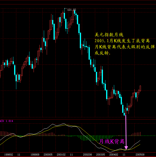 先从2004年底的美元走强开始看日图,周图,月图上同时都出现了美元指数背离的特征。4小时图和1小时图数据我找不到,但如果有,也可以找到背离得特征。