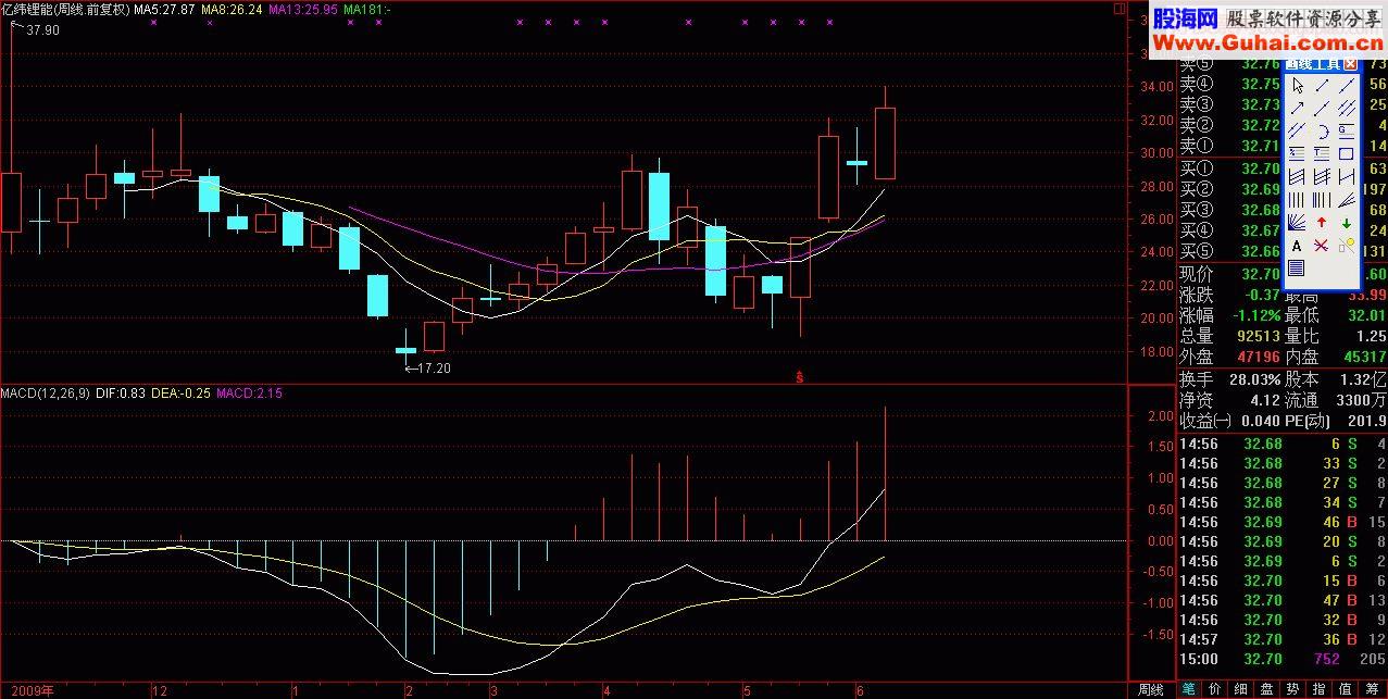案例300014 亿纬锂能 2010,5月21日这一周,MACD出现了龙抬头信号,两周大涨40%。
