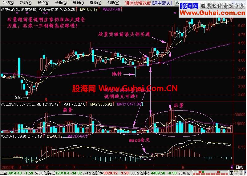 小结:在一轮浩浩荡荡的上扬行情中,如果量能持续放大,股价也能不断地创新高,那么只要量不减不出货即可,直到后量不能超过前量了,那么就可能是构筑虚浪了。(注:虚浪请看下一节)