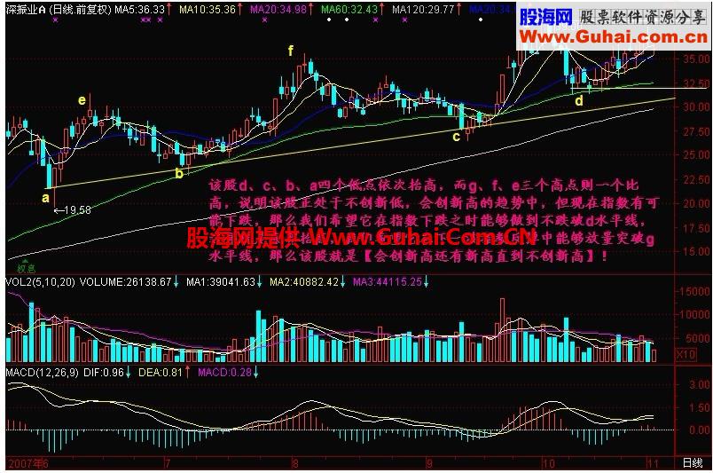还有一个技术特点,就是【能创新高】。再看图中几个高点d、e、f,我们可以明显看到f点比e点高,e点又比d点高,那么我们就可以这么说,一个会创新高的股价,还会创新高,如果继续放量的话,可能还会创新高,直到有一天它不能创新高。简练地说,就是【会创新高还有新高,直到不创新高】。股价不能创新高了,我们就怀疑它可能要做头。