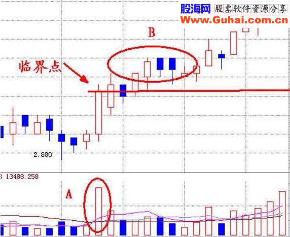 上图所示,我们看到A点当日放出了一根量能,量能的产生一定是由多空双方共同产生的,有买必定有卖,有卖必定有买,这是个双向的成交量。而此处的放量基本就说明了此处出现了多空双方的争峙。那么此时多空双方对战后的结果是什么呢?后面的B点K线震荡均在当日收盘价上方进行,即表示在A处充当多头量能的资金,通过几个交易日后,仍处于赢利状态,那么此时说明了A点的多头力量此时就是这场博弈竞局的胜者,而后的上涨也充分说明了多头力量胜者的现实!当通过B点的震荡,我们从成交量获知了A点多空双方博弈的胜者为多头,则我们实战操作中也可以跟随进入,此时就能跟随多头获取更丰厚的利润。