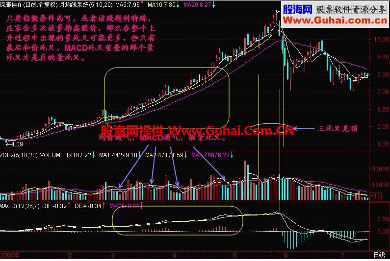 由于主力停止向上收集筹码,成交量开始萎缩,于是出现成交量的死亡交叉。而此时价死叉或MACD死叉并未形成,也就是它们不支持三死叉见顶的结论。