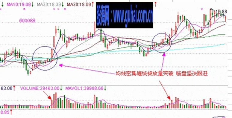 第二,股价需放量突破均线密集缠绕。这点是关键,均线走平意味着多空势均力敌,多为主力在此吸筹阶段。放量突破意味主力拉升股价已经启动,打蛇打七寸,这个地方买进是掐住了股价启动的时空关键点。
