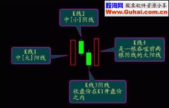 如图中所示,一根大阳线后接着收两根阴线,然后又是一根大阳线,注意后面的一根大阳线要求要高于第二根阴线的最高点,会接近最高点。